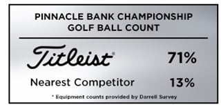 Titleist was the overwhelming golf ball of choice at The Pinnacle Bank Championship, with 71% of the field (101 players) trusting a Pro V1 or Pro V1x golf ball, more than five times the nearest competitor with 13% (20 players) and more than all competitors combined.