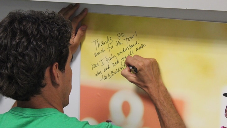 Before leaving the building, Rafa is asked to sign a poster-sized image of himself to commemorate the visit. Sharpie in hand, he writes: