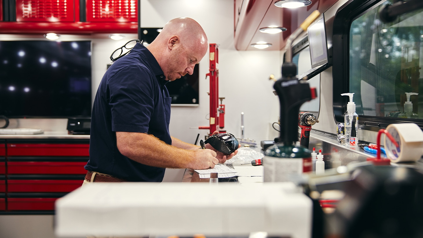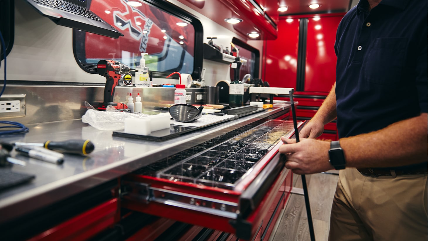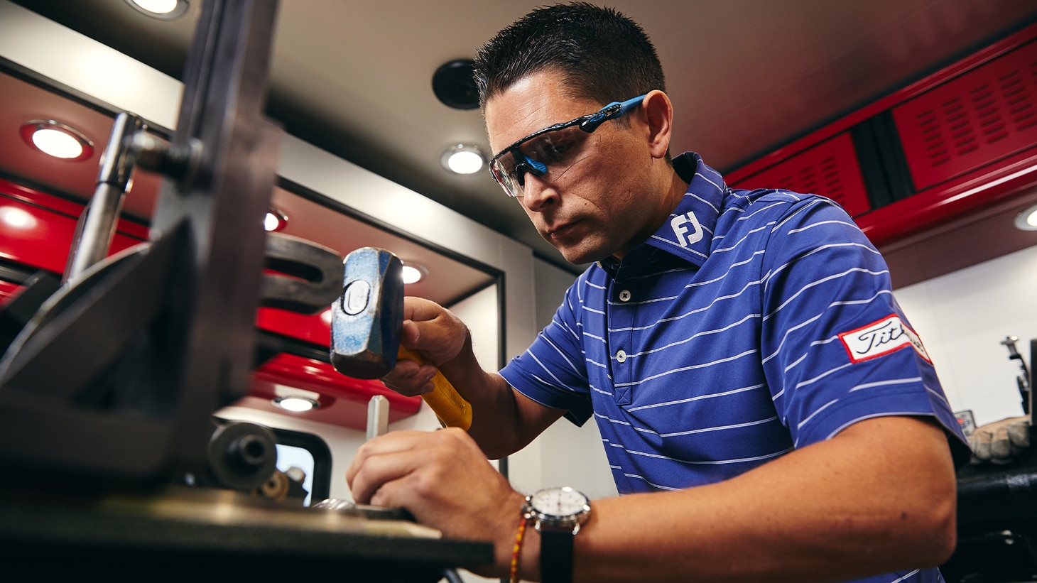 Built to withstand the 30,000 miles of annual travel across the country, the new Tour Trailer extends from 8.5 feet wide on the road to 15.5 feet on site, with four pop-out sections that contribute to 650 square feet of working space. Peter Bezuk, who multi-tasks as the truck’s combination driver and club builder, logs most of the mileage, crisscrossing the U.S. to more than 40 PGA Tour venues. When fully loaded, it meets the maximum weight allowed by the PGA Tour of approximately 35,000 lbs. (Fun fact: That’s about the same weight as a large bucket of 346,000 Pro V1’s.)