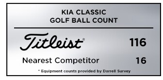 Titleist was the top choice in golf balls at the Kia Classic with more than 4 of every 5 players (116) trusting a Titleist Pro V1 or Pro V1x, more than 10 times the nearest competitor with 16.