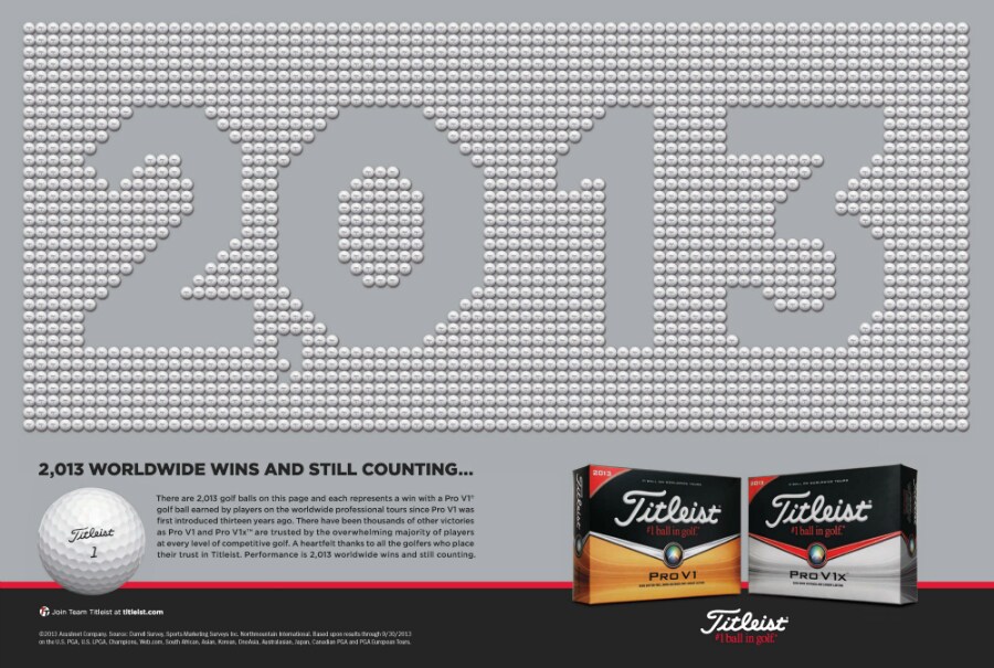 Just in case you didn't catch this the other week, Pro V1x loyalist Henrik Stenson's win at the Tour Championship marked the 2,013th (2013) with a Pro V1 model golf ball across the worldwide professional tours since the Titleist Pro V1 was introduced to tour players in October 2000.