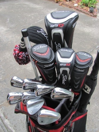 Titleist cart bag/14 way: Left - 915D2(10.25), 913F(13.25), Left - 913h(23.25), 915h(19.50), 913h(16.25) Left - 714 AP2 5,6,7,8 Left - SM4 W 56.10, W SM5 50.08, PW, 9 Putter Well - Scotty Studio Newport 2