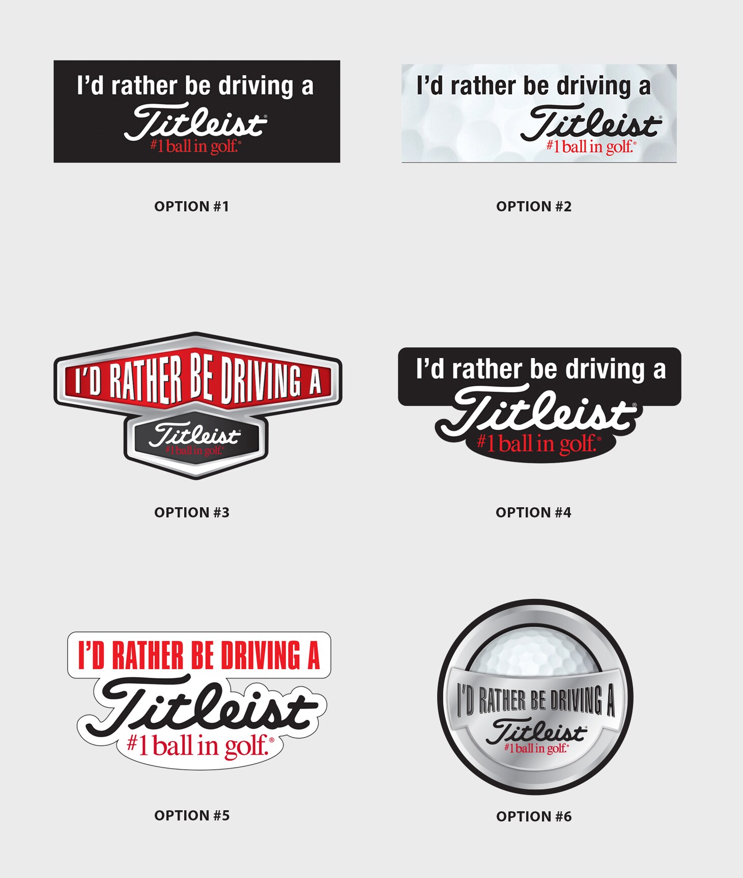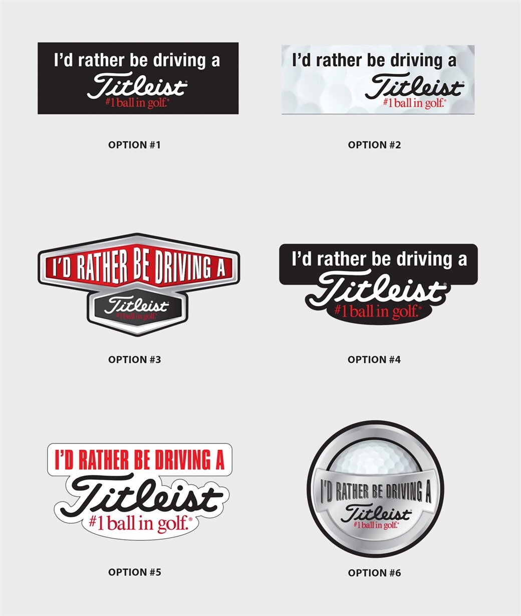 Hi Team Titleist, We have another poll for you this week! We are creating new Titleist bumper stickers and are looking for your help. Take a look at the options below and vote for your favorite. Thanks! Abby Team Titleist Staff