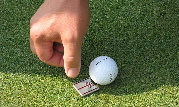 It’s called the Scotty Cameron Ball Tool and it’s the next generation in ball markers. It’s a flat, square piece of metal with a small semi-circular indention cut into one side where the golf ball goes. Stamped on the marker next to the indention is a series of alignment markers that allows the player to line up his putt even after he marks his ball"