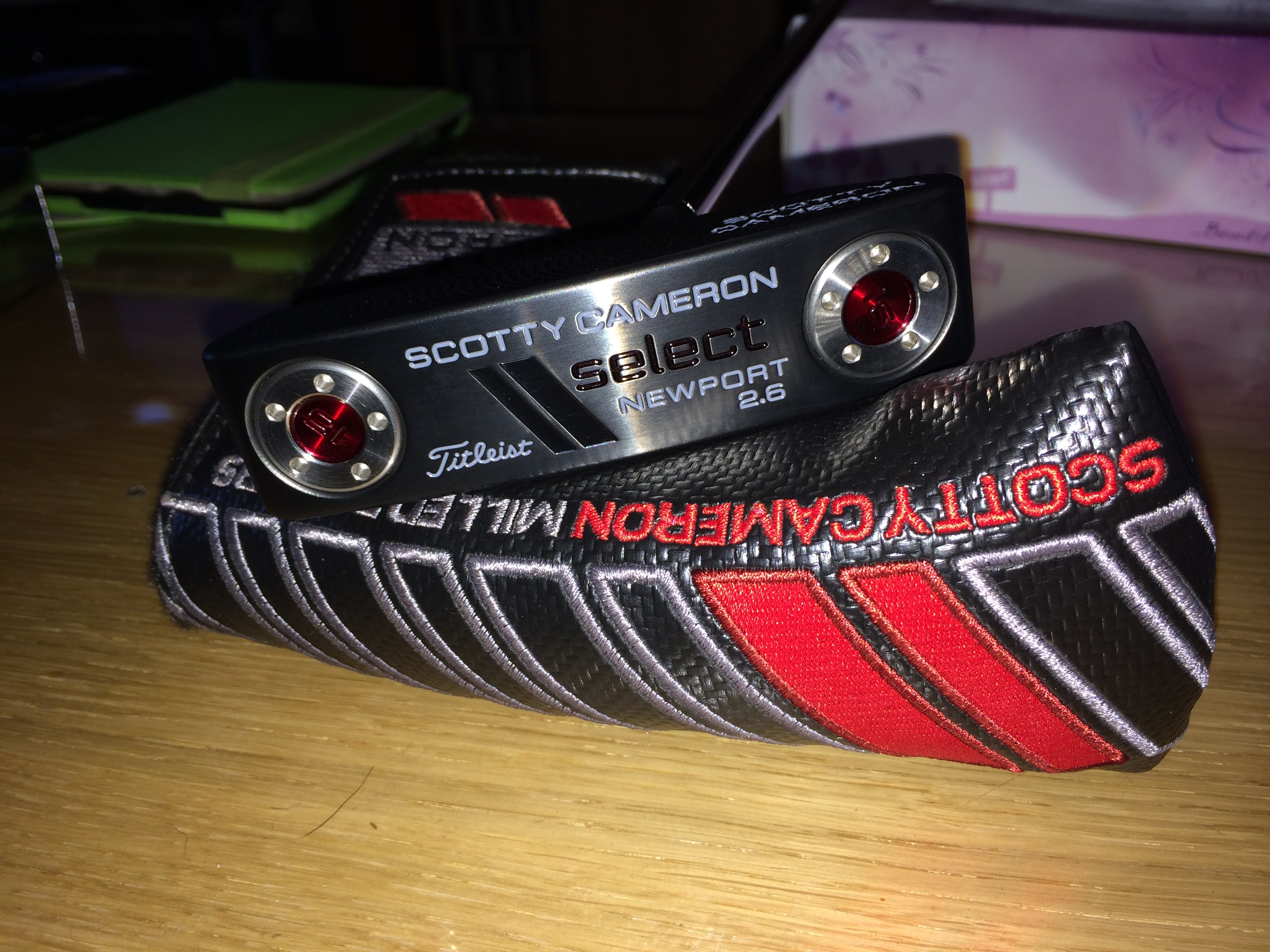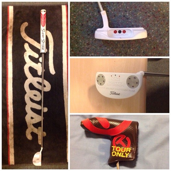 Putter: Scotty Cameron Custom Whiteout Fastback 1.5 with Red/Black Paintfill and Superstroke Slim 3.0 and Tour Only Headcover