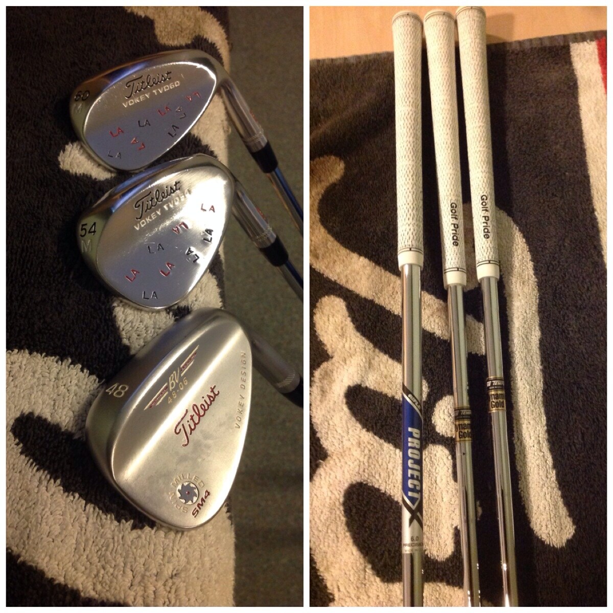 Wedges: 48 Degree Vokey SM4 with Project X 6.0 Hard Stepped Shaft custom white and red paint fill and Golf Pride BCT Full Cord White Grips and 54 and 60 Degree Custom Vokey TVD M Grind custom LA stamping (initials) with DG S300 Shaft and Golf Pride BCT Full Cord White Grips +2 Layers